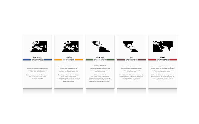 Dem ewigen Wunsch nach fernen Ländern und neuen Eindrücken folgend, begeben wir uns auf eine Reise, auf der uns Koordinaten den Weg zu inspirierenden Orten weisen: Les Destinations – das sind fünf hochwertige Unisex-Düfte, hinter deren rätselhaften Zahlenkombinationen sich jeweils eine wunderbare olfaktorische Welt eröffnet.